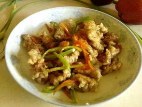 3. 炸肉片:锅中倒入足量食用油,油温升至5成热时,放入裹粉的肉片,炸至金黄酥脆,捞出沥油。